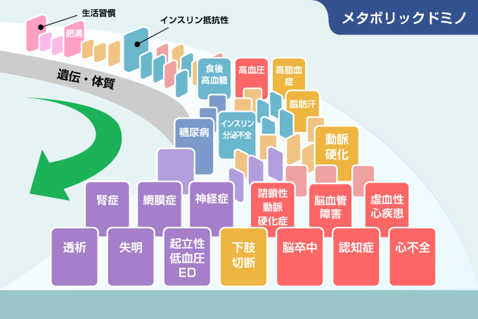 内臓脂肪による肥満から起こるメタボリックシンドローム、そして糖尿病、動脈硬化、慢性腎臓病、心筋梗塞、脳卒中へドミノ倒しのように次々と病気が襲ってくることから、この一連の流れを、メタボリックドミノといいます。
