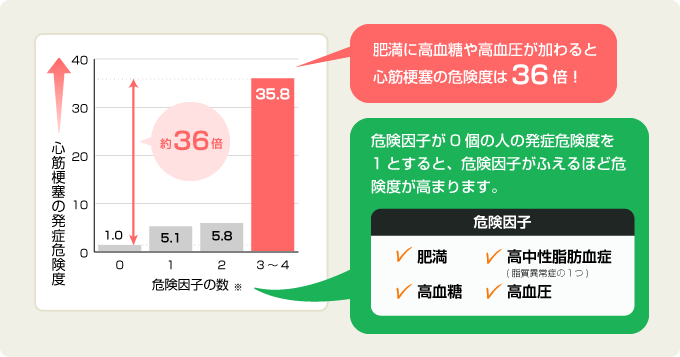 メタボリックシンドロームとは、内臓の周囲に集中して脂肪(内臓脂肪)がたまる内臓脂肪型肥満に加え、高血圧、高血糖、血中脂質の異常といった動脈硬化の危険因子のうち、2つ以上を重ね持つ状態をいいます。メタボリックシンドロームになると、糖尿病や脂質異常症、高血圧症になりやすいだけでなく、これらの生活習慣病の前段階でも動脈硬化が進みやすく、心筋梗塞や脳卒中の発症リスクが格段に高くなることが分かっています。