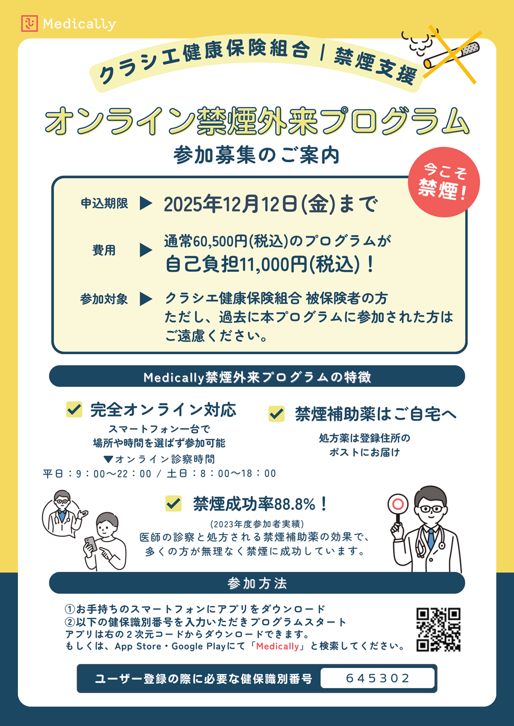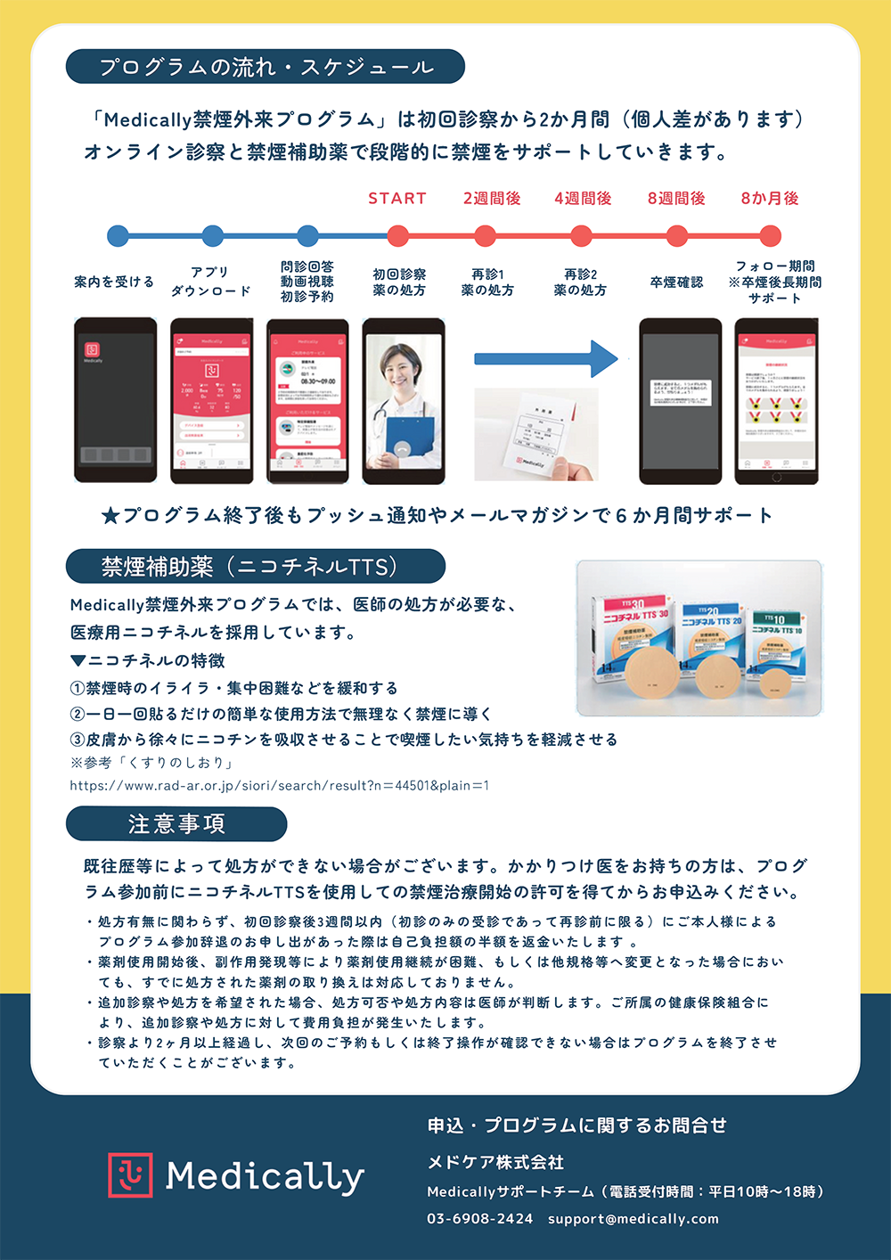 お手持ちのスマホを使ってインターネット上で効率的に禁煙の専門医を受診するもので、予約から診察、費用の決済までをオンラインで完結できます。