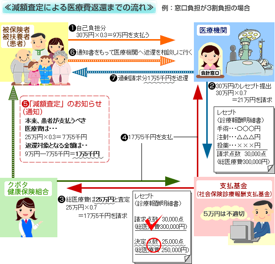 支払基金は、医療機関が患者から過剰に医療費を徴収したと判明した場合、保険者(クボタ健康保険組合等)を経由して査定内容を患者に通知することになっています。患者はこの通知書をもとに、医療機関と直接交渉し医療機関に減額査定された自己負担金の返還を求めることができます。診療内容によっては返還されない場合もあります。厚生労働省では具体的な基準として「窓口での自己負担額に1万円以上の減額が判明した場合」に保険者から被保険者宛てに通知するよう各保険者に指導しています。クボタ健康保険組合においても指導を遵守し支払基金より通知された減査定内容を、被保険者の皆さんに書面でお知らせしています。