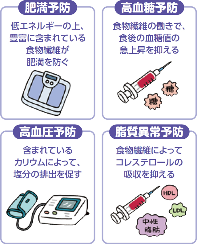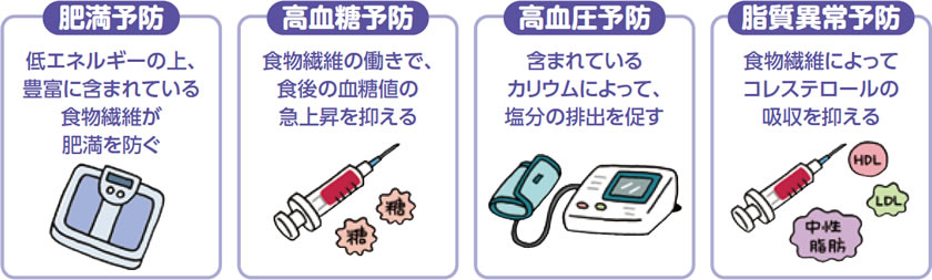 野菜・果物に豊富に含まれている食物繊維は、とくに積極的にとりたい栄養素の1つです。生活習慣病予防の他にも、腸内環境を整え、便秘の解消にもつながります。