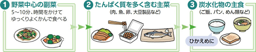 野菜を最初に①~③の順で食べると、食べすぎや血糖値の急上昇を防げます。
