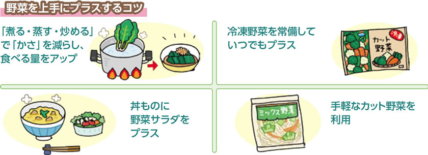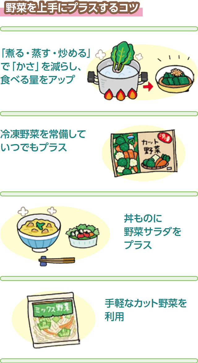 日々の食事の中で、できるだけ多くの野菜をとるように工夫しましょう。