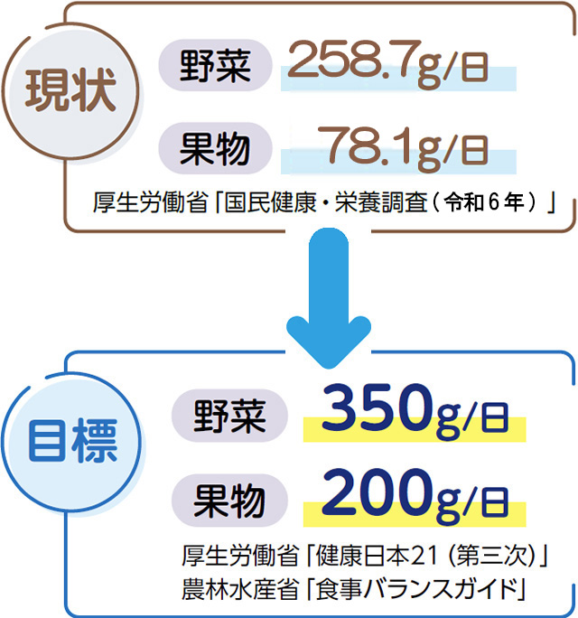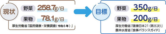 目標と比べて、野菜・果物とも1日約100g不足しています。