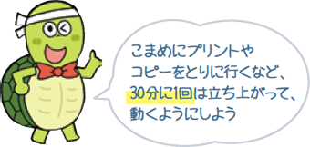 デスクワークで1日の大半を座りっぱなしで過ごしている人も多いのでは?座りすぎは、血流や筋肉の代謝が低下し、健康に害を及ぼすことがわかっています。仕事などで座る時間が長い人は、できるだけ仕事の合間に“立つ・動く”ことを意識しましょう。