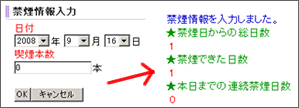 禁煙履歴、禁煙開始日からの日数と、連続禁煙日数(喫煙0本の日)等が確認できます。
