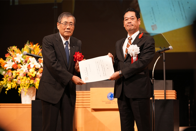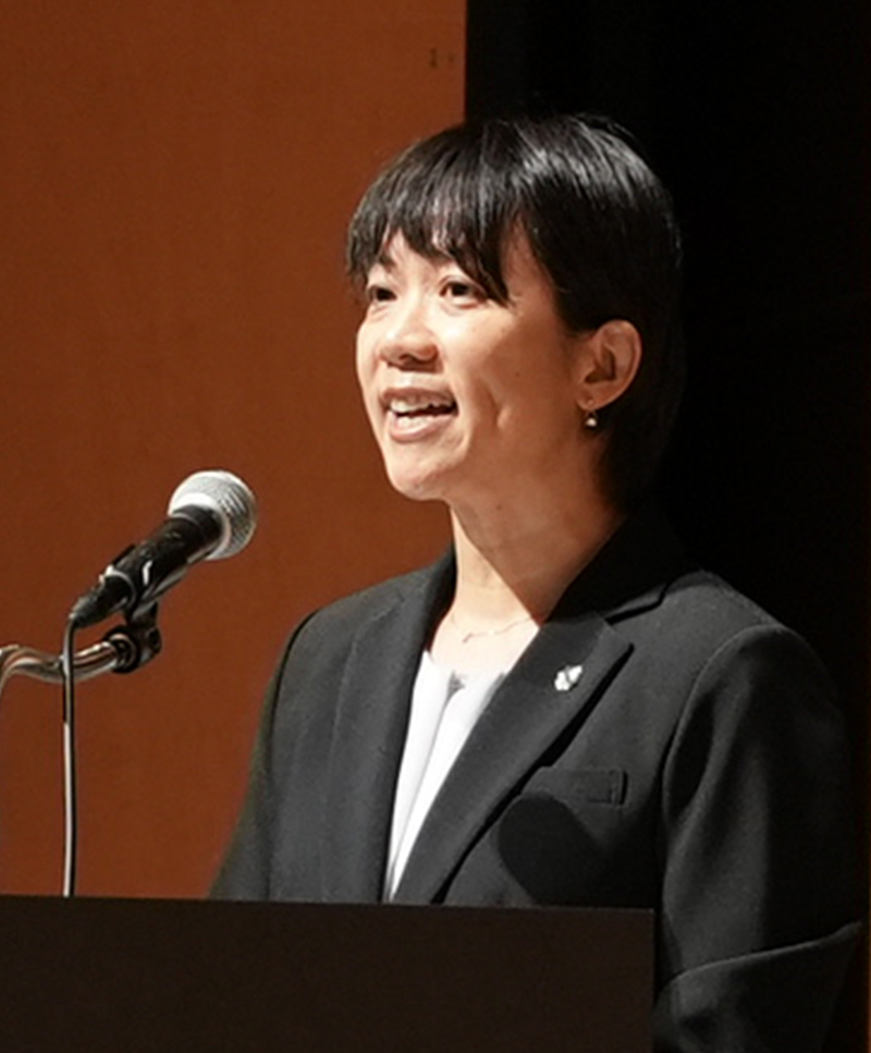 ―基にした大会決議案を、本大会の所管委員会である企画委員会委員の山形銀行健康保険組合 保科敦子常務理事が力強く朗読。決議を出席者全員の賛同で採択し、その場で本日の出席がかなわなかった上野賢一郎厚生労働大臣に代わり出席いただいた巽慎一厚生労働省大臣官房審議官に決議文を手交した。