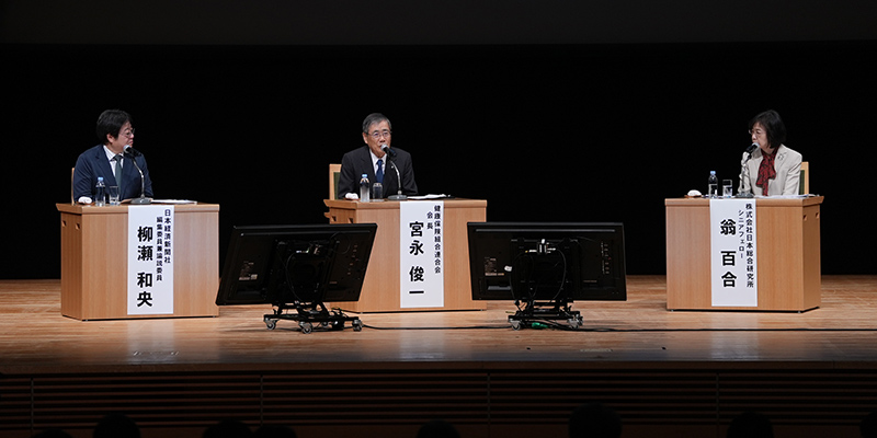 大会の後半では特別企画として、「全世代型社会保障制度への改革と保険者への期待」をテーマに、まず、株式会社日本総合研究所シニアフェローの翁 百合氏による講演が行われた。その後、日本経済新聞社編集委員兼論説委員の柳瀬和央氏をモデレーターとして、翁氏と宮永会長との対談が行われた。