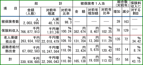 老人保健・退職者給付両拠出金合計では322億円も増加し、前年比110.80%と2桁の増加となったが、保険料収入の伸びは18億円にすぎず財政を一段と悪化させている。また両拠出金の被保険者1人当たりでは165,138円で、前年比19,030円増(113.02%)と保険料収入の伸び(8,407円増)を2倍強も上回っている。