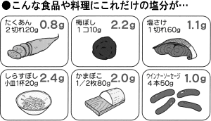 平成16年度の国民健康・栄養調査の結果、1日当たりの食塩摂取量は10・7gでした。健康な人は10g以下が目標です。血圧が少し高めの人は7g程度にしましょう。