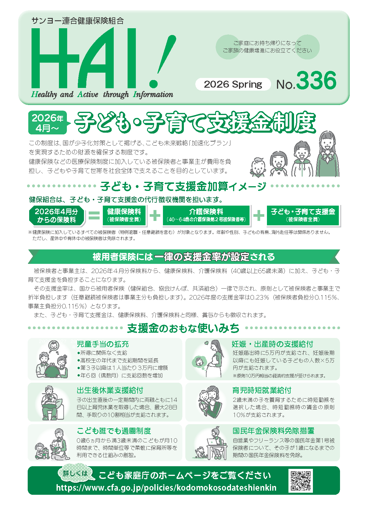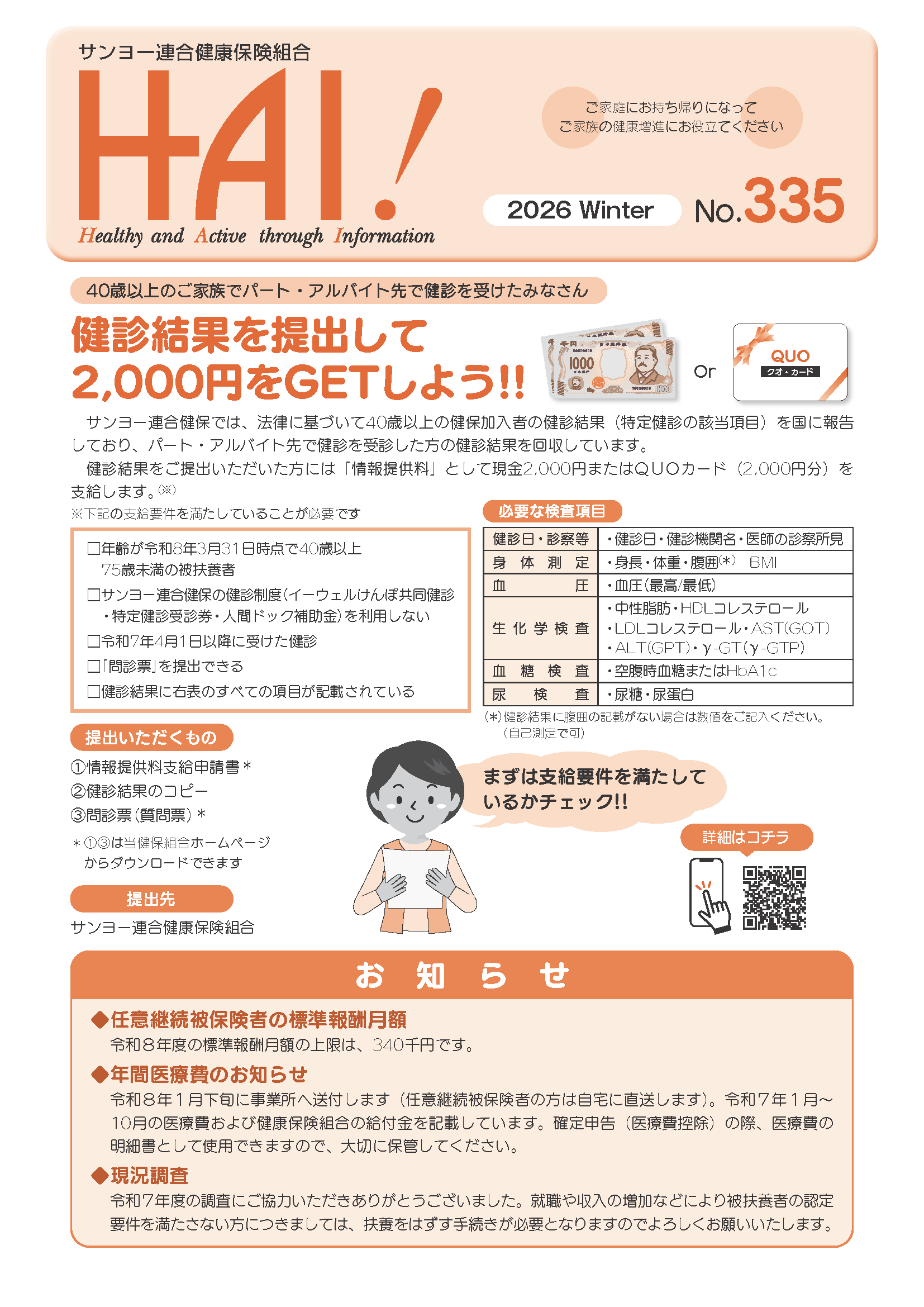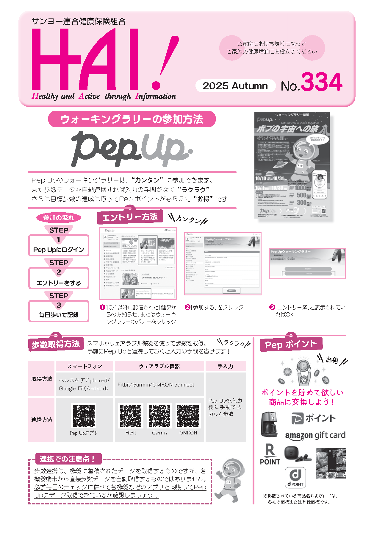 HAI!は当健保組合と被保険者及びご家族を結ぶための情報誌として、年4回(春・夏・秋・冬)発行します。みなさまの健康の保持・増進のため、健康づくりや疾病予防、健康保険に関する情報をお届けしてまいります。みなさまの健康づくりにお役立てください。