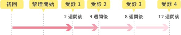 まず、初回受診時に医師と本人が話し合って禁煙開始日を決定します。この禁煙開始日から、2週間後、4週間後、8週間後、12週間後の計4回受診します。