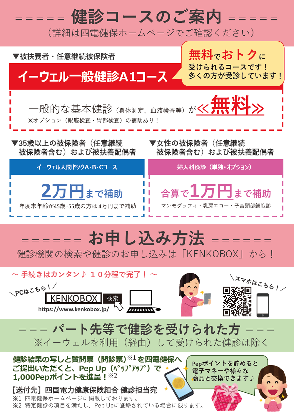 40歳以上の一般被扶養者と任意継続被保険者・被扶養者で健康診断(人間ドック等)のお申し込みがまだの方へ(株)イーウェルより「健康診断受診勧奨ハガキ」をお送りさせていただいております。 (7月22日時点でのお申込み状況につき、既にお申し込み済みの場合は何卒ご容赦ください)皆さまの疾病予防・早期発見のためにも、ぜひ健康診断を受診下さいますようお願いいたします。