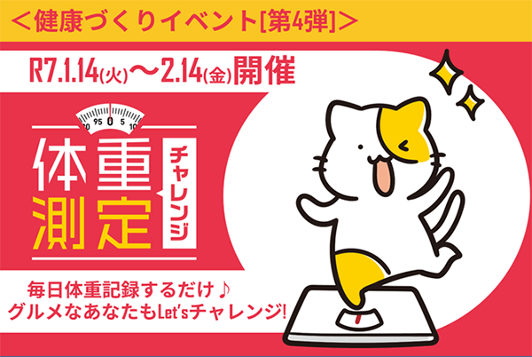 <健康づくりイベント[第4弾]>として、「Pep Up(ペップアップ)」で、『体重測定チャレンジ』を令和7年1月14日から2月14日の間で開催いたします。