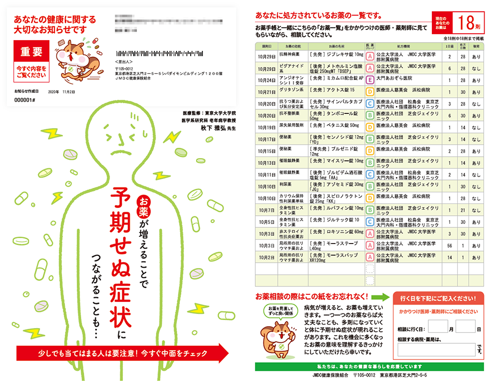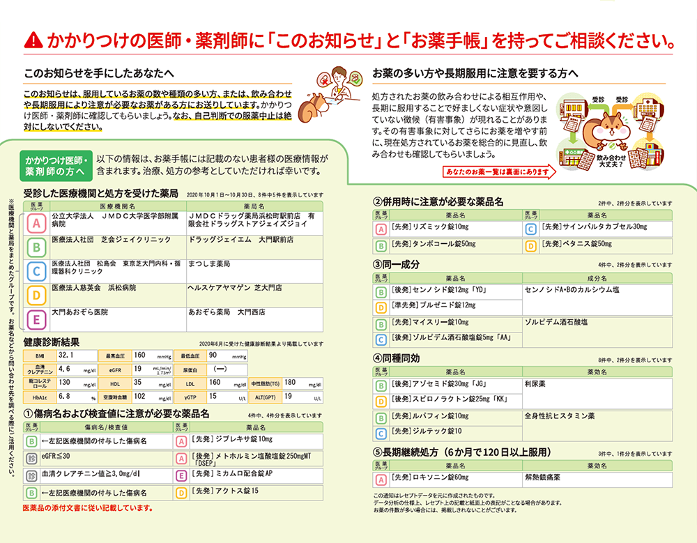 薬剤処方において、重複・多剤投薬等により健康被害のリスクがあると疑われる方へ、「適正服薬通知」を郵送しております。 処方されたお薬の飲みあわせによる相互作用や、長期に服用することで好ましくない症状や意図していない徴候(有害事象)が現れることがあります。 通知が届いた方は、かかりつけ医師・薬剤師に確認してもらいましょう。 詳細ページ
